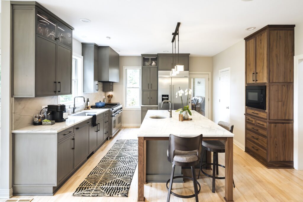 Bếp của người thích sang trọng – kết hợp gỗ tự nhiên với mặt đá vân mây.